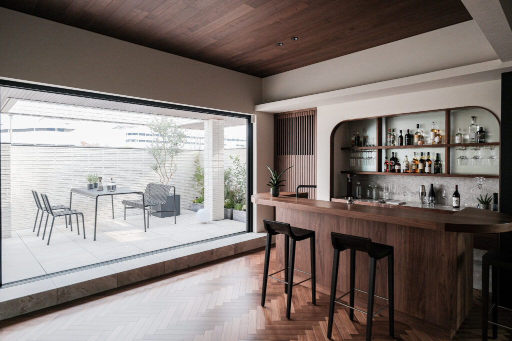 - リビング、階段壁、テラス床、ステップ、ホームバー(カウンタートップ・棚一部)